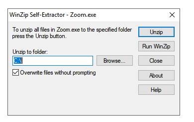 Jalankan file Zoom.exe dan jangan mengubah lokasi drive yang dituju lalu klik UNZIP. Seperti pada gambar berikut: