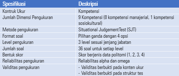 Konstruk ukur yang disasar dalam alat ukur adalah kompetensi sesuai dengan yang dijelaskan pada Permen PANRB 38 Tahun 2017 mengenai Standar Kompetensi Jabatan Aparatur Sipil Negara. Kompetensi menurut peraturan tersebut didefinisikan sebagai seperangkat kemampuan yang pengetahuan, keterampilan, dan sikap atau perilaku yang dapat diamati, diukur, dan dapat dikembangkan yang berkaitan dengan jabatan pegawai. Kompetensi mengacu pada pengetahuan, keterampilan, dan kemampuan yang dimiliki seseorang sehubungan dengan tanggung jawab pekerjaannya. Ini adalah aspek penting dari kinerja pegawai dan terkait langsung dengan kemampuan mereka untuk melaksanakan tugasnya secara efektif. Dalam konteks Aparatur Sipil Negara (ASN), kompetensi dapat dipahami sebagai seperangkat keterampilan dan keahlian khusus yang diperlukan untuk suatu jabatan tertentu dalam instansi pemerintahan.