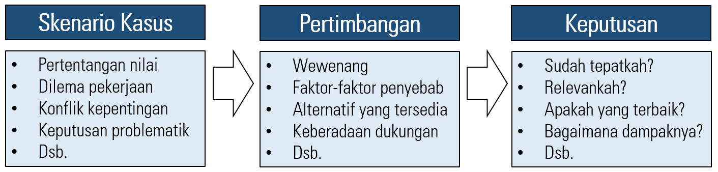 Gambar 1 menunjukkan bahwa dalam sebuah butir memuat skenario kasus yang dapat memiliki beberapa fitur terkait dengan masalah yang dihadapi. Misalnya, pertentangan nilai antara nilai-nilai pribadi yang bertabrakan dengan nilai kejujuran, dilema pekerjaan antara penyelesaian tugas yang sesuai dengan prosedur atau penyelesaian tugas yang kreatif, serta pengambilan keputusan yang bersifat problematik. Semua skenario yang dilibatkan dalam penyusunan butir memerlukan pertimbangan sebelum diputuskan dalam sebuah tindakan yang ditunjukkan dengan memilih opsi jawaban. Pertimbangan tersebut dapat berupa posisi atau wewenang pegawai, pertimbangan mengenai faktor penyebab, nilai-nilai organisasi atau keberadaan dukungan. Semua pertimbangan tersebut kemudian diimplementasikan dalam sebuah keputusan yang telah dipikirkan ketepatannya, relevansinya, serta dampak dari keputusan yang dibuat.