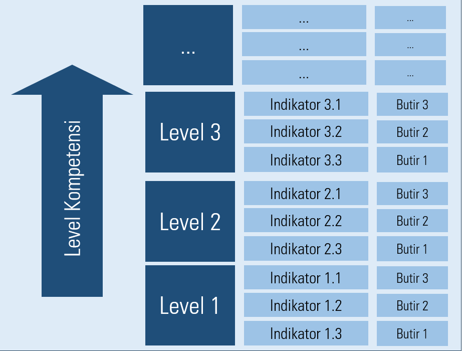 Gambar 6 menjelaskan keterkaitan antara level kompetensi, indikator serta butir-butir yang ditulis. Pada gambar tersebut terlihat bahwa setiap level memuat tiga indikator seperti yang telah ditetapkan oleh PANRB 38/2017. Indikator-indikator tersebut kemudian menjadi dasar untuk penulisan butirnya. Oleh karena butir tersebut mengacu pada jabatan dan level yang berbeda-beda maka kasus-kasus dalam skenario yang dilibatkan di dalam butir disesuaikan dengan tugas dan wewenang pegawai pada jabatan tersebut.